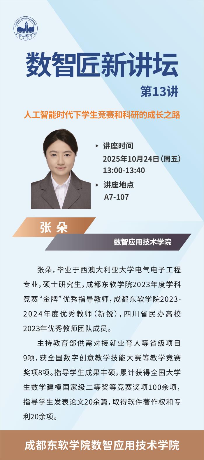 “数智匠新”讲坛第13讲特邀数智应用技术学院软件工程技术系张朵老师,开展《人工智能时代下学生竞赛和科研的成长之路》专题讲座,欢迎各位师生踊跃参加!