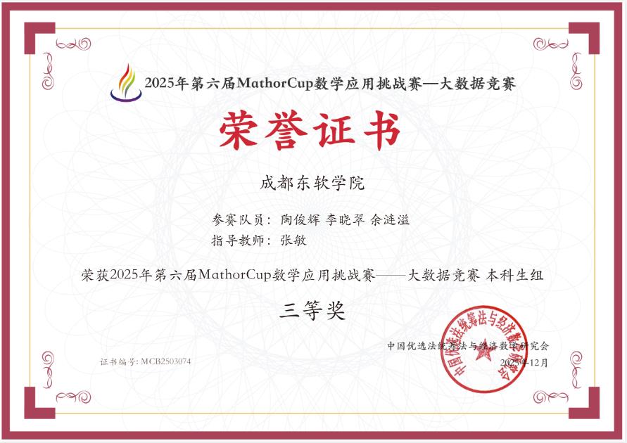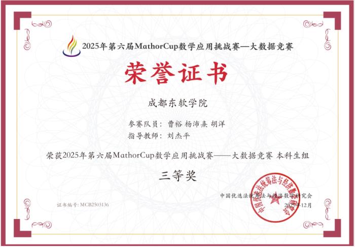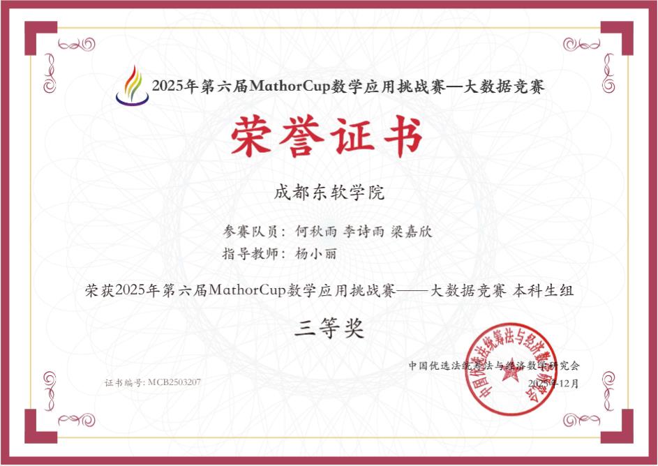 近日,备受全国高校关注的 2025 年第六届 MathorCup 高校数学建模挑战赛获奖名单正式揭晓。我校软件工程技术系实验室学子组建的四支参赛队伍,凭借扎实的数学功底、创新的建模思维与高效的团队协作,从全国 1865 支参赛队伍中脱颖而出,最终斩获全国二等奖 1 项、三等奖 3 项,再创实验室在该项赛事中的历史最佳成绩!