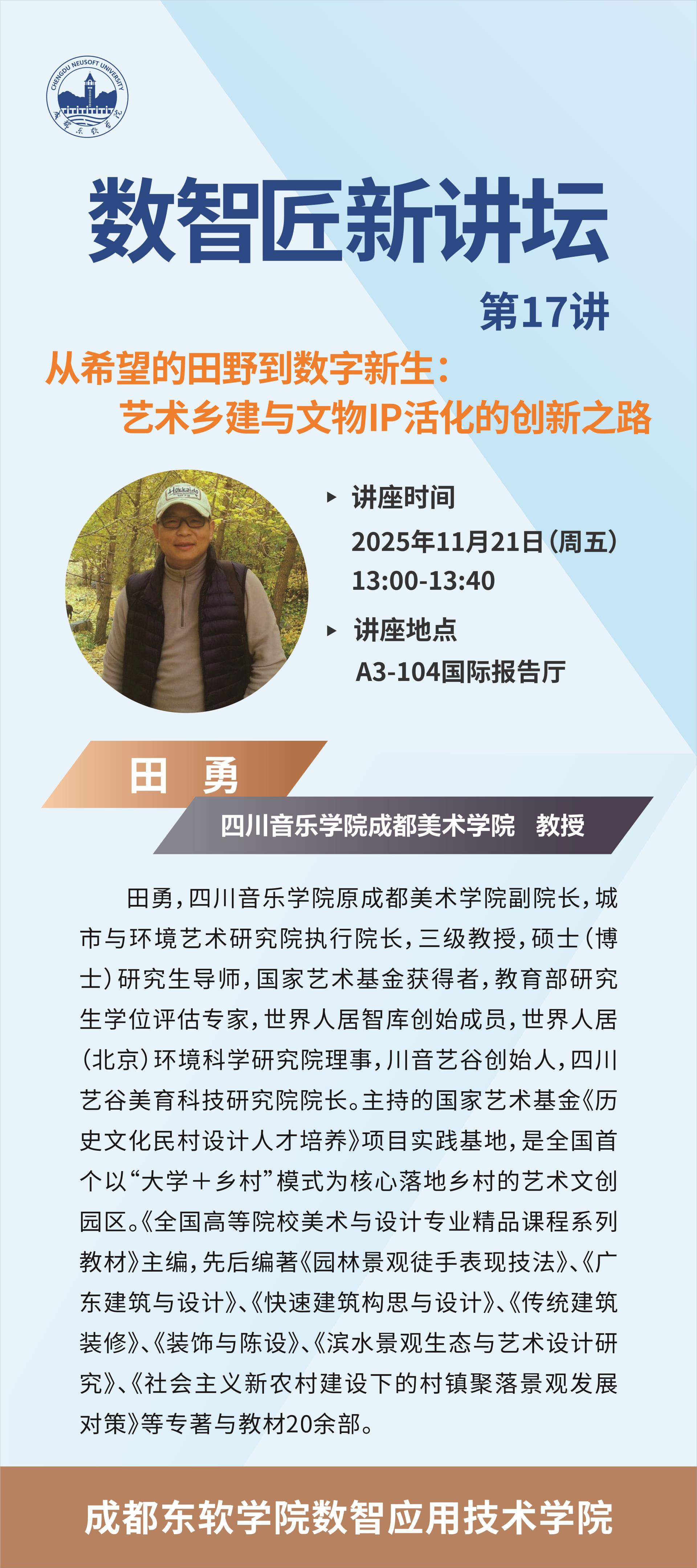 “数智匠新”讲坛第17讲特邀四川音乐学院原成都美术学院副院长,硕士(博士)研究生导师田勇教授,开展《从希望的田野到数字新生:艺术乡建与文物IP活化的创新之路》专题讲座,欢迎各位师生踊跃参加!