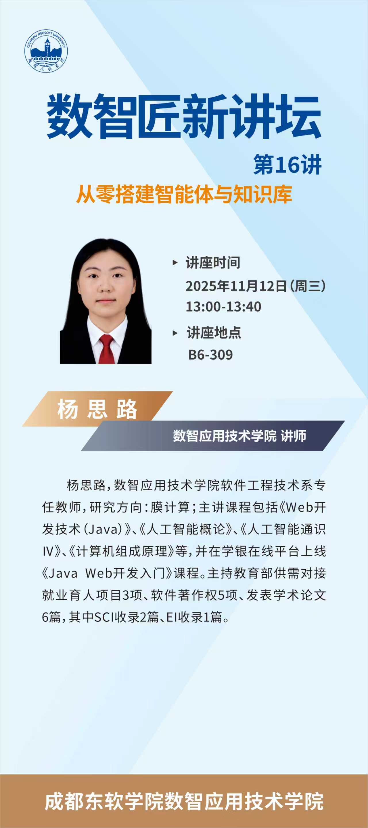 “数智匠新”讲坛第16讲特邀数智应用技术学院软件工程技术系杨思路老师,开展《从零搭建智能体与知识库》专题讲座,欢迎各位师生踊跃参加!