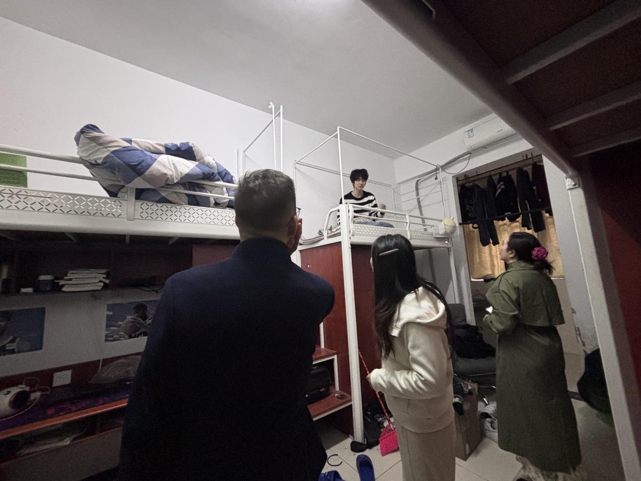 艾珏宇副书记与学生亲切交流,强调安全重要性;对插线板使用不规范、杂物堆积等问题,现场提出卫生、寝室环境等整改意见、定整改时限。素质教师同步开展安全教育,结合宣传教育月活动,重申消防、用电等安全注意事项,引导学生树立“安全第一”理念。