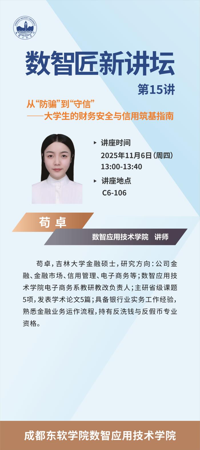 “数智匠新”讲坛第15讲特邀数智应用技术学院电子商务系苟卓老师,开展《从“防骗”到“守信”——大学生的财务安全与信用筑基指南》专题讲座,欢迎各位师生踊跃参加!